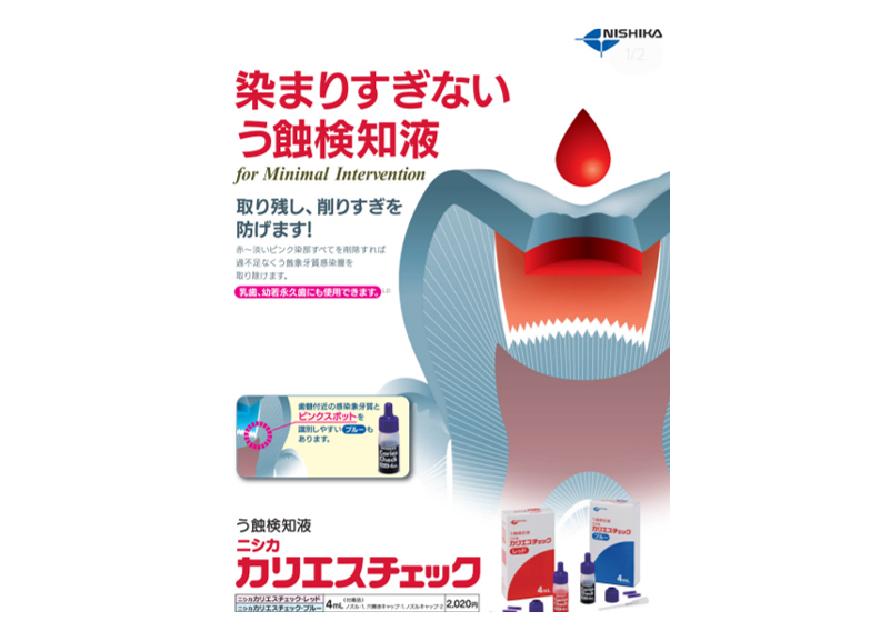 カリエスチェックを塗布し、水洗後、色が残っている部分がむし歯です。むし歯の取り残しを無くすことと、不必要に歯を削りすぎてしまうことがないようにするための確認のために使用します。