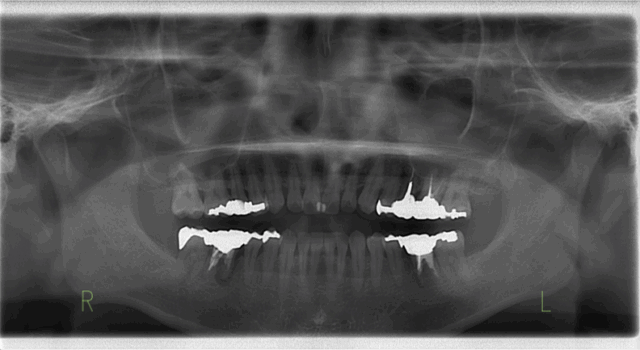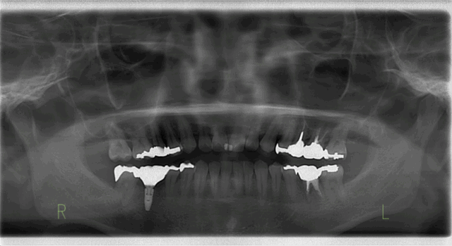 | 処置内容 | 下顎臼歯部欠損→インプラント 下顎前歯部根尖性歯周炎→根管治療 既存の上下補綴物(セラミック冠)を撤去し、咬合(かみ合わせ)の再建や人口歯の形態の変更などのフルマウス治療 |