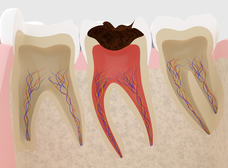 根管治療とは、一般に『歯の神経を抜く治療』『歯の根っこの治療』といわれる治療のことです。 私たちの歯の内側には、神経や血管を含む「歯髄(しずい)」と呼ばれる組織が存在しています。これらの神経や血管は「根管」と呼ばれる細い管を通って、全身の神経や血管へとつながっています。