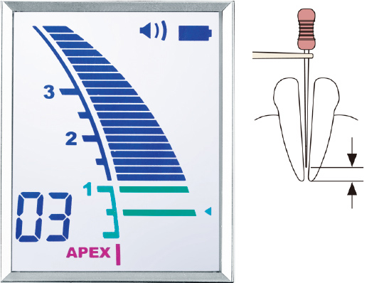 2つの周波数におけるインピーダンス差を比較する独自方式で、根尖の位置を正確に検出します。オート/マニュアルの2モードと根管ごとの調整機能で、従来は測定が難しかった多様な症例にも対応。出血がある根管でも測定精度が落ちず、大きくなったアナログメーターが繊細なファイル操作を補助します。